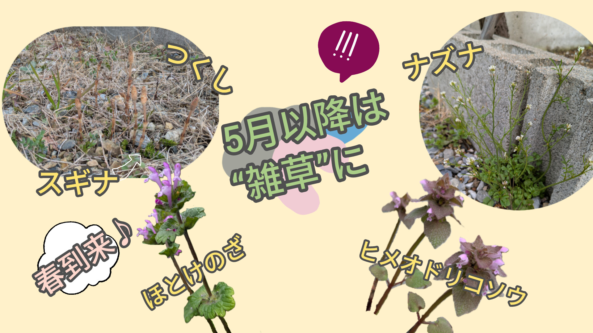‥‥と共に気になってくるのが、畑や庭、駐車場の草!!今はかわいい“つくし”は、その後“スギナ”としてぐんぐんと成長して広範囲に広がっていきます。今現在、四つ葉の“クローバー”でも、その後は、シロツメクサが生えてどんどん横に広がっていく“雑草”と化します。